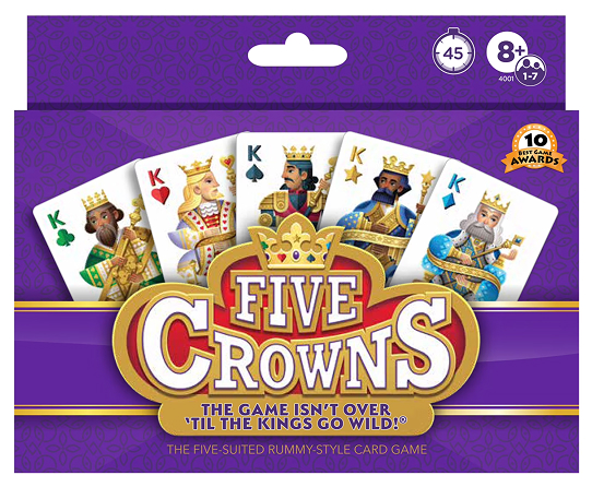 Five Crowns is rummy with a five-suited deck and a twist. The set collection aspect of rummy is basically the same, with groups of three cards in either runs or denominations making a valid meld. The twist is that in each hand, the number of cards required to create a meld increases, from three cards in the first hand to thirteen in the last. The game, therefore, consists of eleven hands.